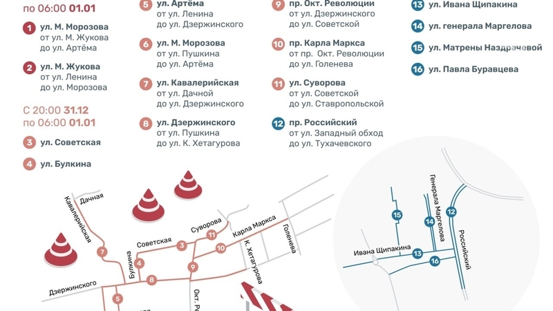 С 20:00 31 декабря до 6 часов 1 января проехать будет нельзя по улицам Артёма (от Ленина до Дзержинского), Морозова (от Пушкина до Артёма), Дзержинского (от Пушкина до К. Хетагурова), Советской, Булкина, Кавалерийской (от Дачной до Дзержинского), Суворова (от Советской до Ставропольской), проспектам К. Маркса (от Голенева до проспекта Октябрьской Революции), Октябрьской Революции (от Дзержинского до Советской), Российскому (от Западного обхода до Тухачевского), а также на улицах Ивана Щипакина, генерала Маргелова, Матрёны Наздрачёвой и Павла Буравцева. Фото: ИА «Победа26»C 20:00 6 января до 4:00 7 января движение перекроют по улице Дзержинского (от Ломоносова до Артёма), улице Суворова (от Советской до Ставропольской), переулку Фадеева (от Войтика до Гражданской), улице Соборной (от Пирогова до переулка Командирского). Фото: ИА «Победа26»А с 20:00 18 января до 4:00 19 января перекроют улицу Лесную. Объезд организован по улице Октябрьской и Лопырина. На это время отменяется работа троллейбусов № 1, 2, 4, 9, 13 на закрытых участках. 18:31 Сегодня
