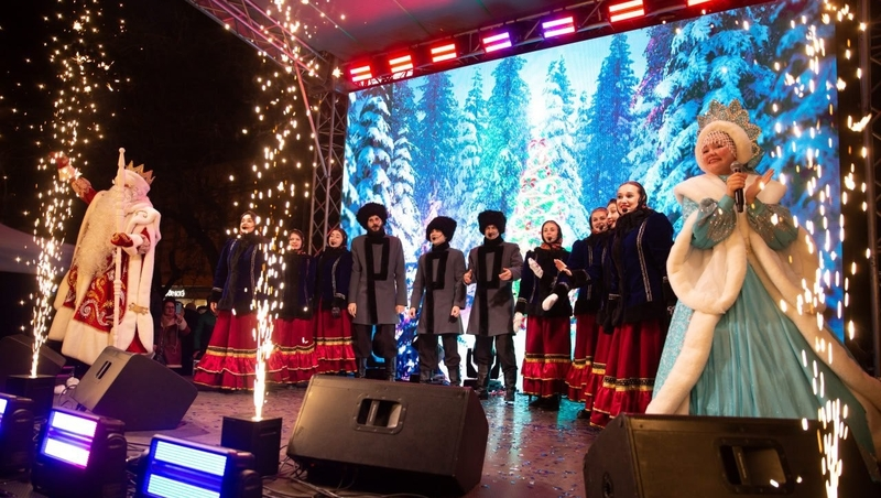 Вместе с 25-метровой елью в столице региона засияли и другие арт-объекты: променад, шатёр, инсталляция «Ставрополь», а также гирлянды на 33 праздничных деревьях, символизирующих округа Ставрополья. Новогодний антураж в этом году обновили. На закупку и установку шатра и променада объявлялся тендер с начальной стоимостью работ почти в 50 млн рублей. «В этом году мы постарались преобразить наш город, сделать его облик ярче и принести радость всем жителям», — сказал глава города Иван Ульянченко. На праздничной сцене выступили Дед Мороз, Снегурочка и казаки. Хедлайнером вечера стала победительница телешоу «Голос. Дети» Мария Никулина.Артисты поздравили ставропольцев | |